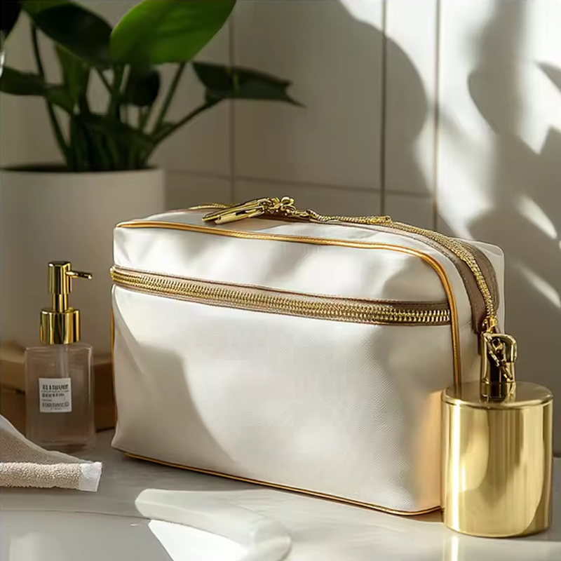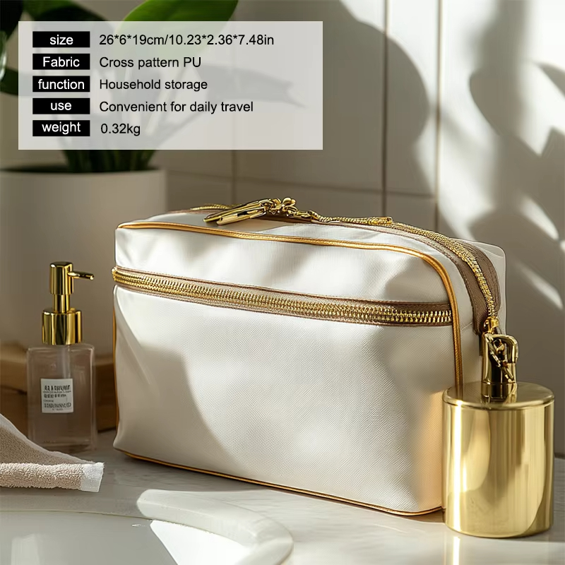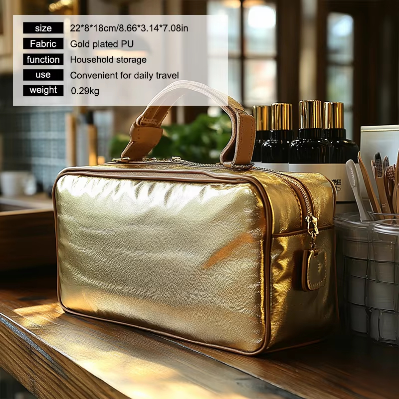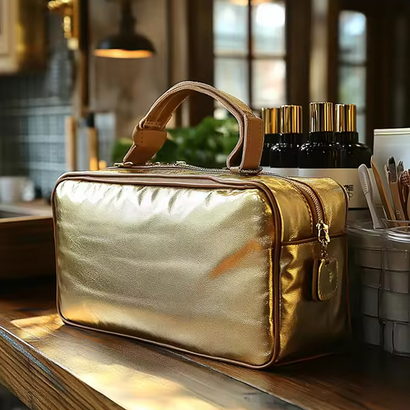 Il tessuto PU placcato oro utilizzato in questa borsa cosmetica non è solo visivamente accattivante ma anche resistente e facile da mantenere. La finitura dorata aggiunge un tocco di eleganza, rendendolo più di un semplice articolo funzionale —è anche un pezzo di tendenza. La pelle PU di alta qualità è morbida al tatto, mentre la placcatura in oro fa sì che la borsa si distingua nella tua collezione di articoli essenziali da viaggio.