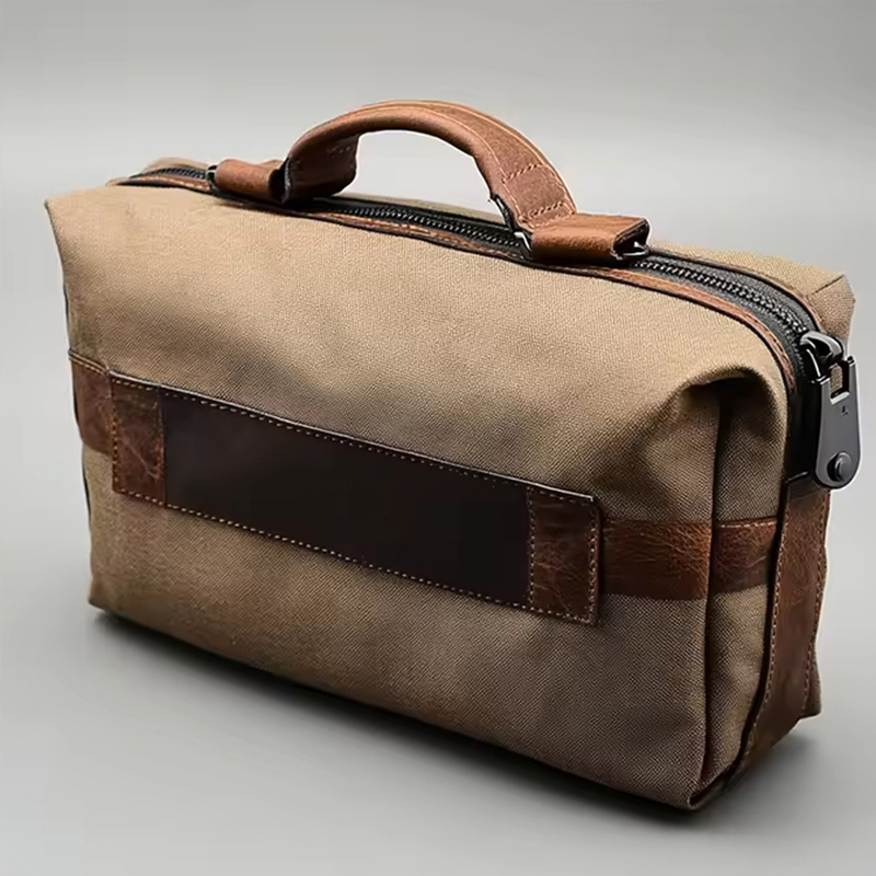 Realizzata in tessuto di tela di alta qualità, questa borsa da toilette da uomo è costruita per resistere ai rigori dell'uso quotidiano. Il materiale robusto garantisce longevità, offrendo resistenza all'usura. Gli accenti in pelle PU (poliuretano) ne migliorano l'estetica generale fornendo al contempo una protezione aggiuntiva, rendendola ideale per coloro che desiderano una soluzione di stoccaggio elegante ma affidabile.