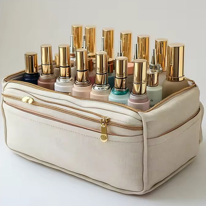 Una delle caratteristiche distintive di questa borsa cosmetica è la sua grande capacità. Dotato di numerosi scomparti e sezioni, offre ampio spazio per i tuoi prodotti per il trucco, articoli essenziali per la cura della pelle e altri oggetti personali. Che tu stia preparando i bagagli per un weekend fuori porta, un viaggio di lavoro o semplicemente organizzando le tue necessità quotidiane, questa borsa ti consente di separare facilmente i tuoi oggetti per un rapido accesso. Puoi conservare tutto, dal fondotinta, mascara e rossetti alle creme idratanti, pennelli e prodotti per la cura dei capelli, il tutto in un unico spazio organizzato.