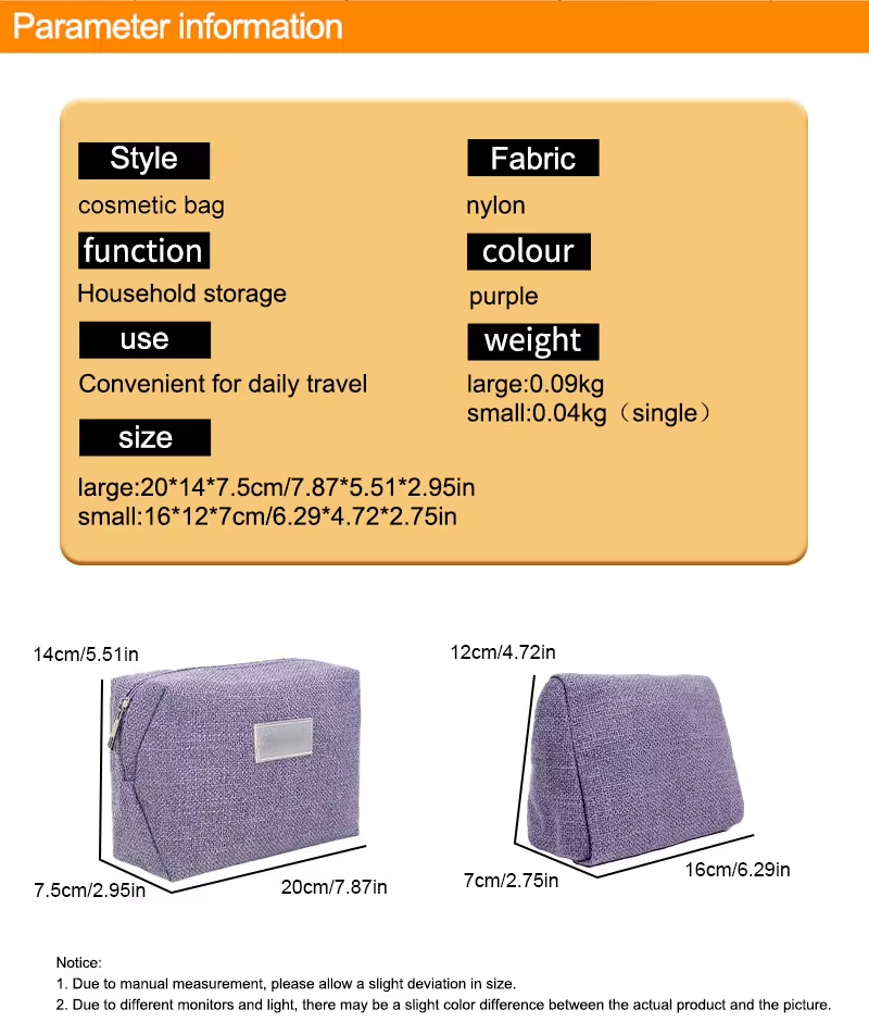 Realizzata con cuciture di qualità e cerniere robuste, la borsa è progettata per un utilizzo a lungo termine. L'apertura e la chiusura fluide della cerniera rendono comodo l'accesso rapido agli oggetti. La sua struttura rinforzata gli consente di mantenere la forma pur essendo sufficientemente leggero da poter essere trasportato. Questo equilibrio tra durata e praticità lo rende un accessorio utile sia per l'organizzazione domestica che per le esigenze di viaggio.