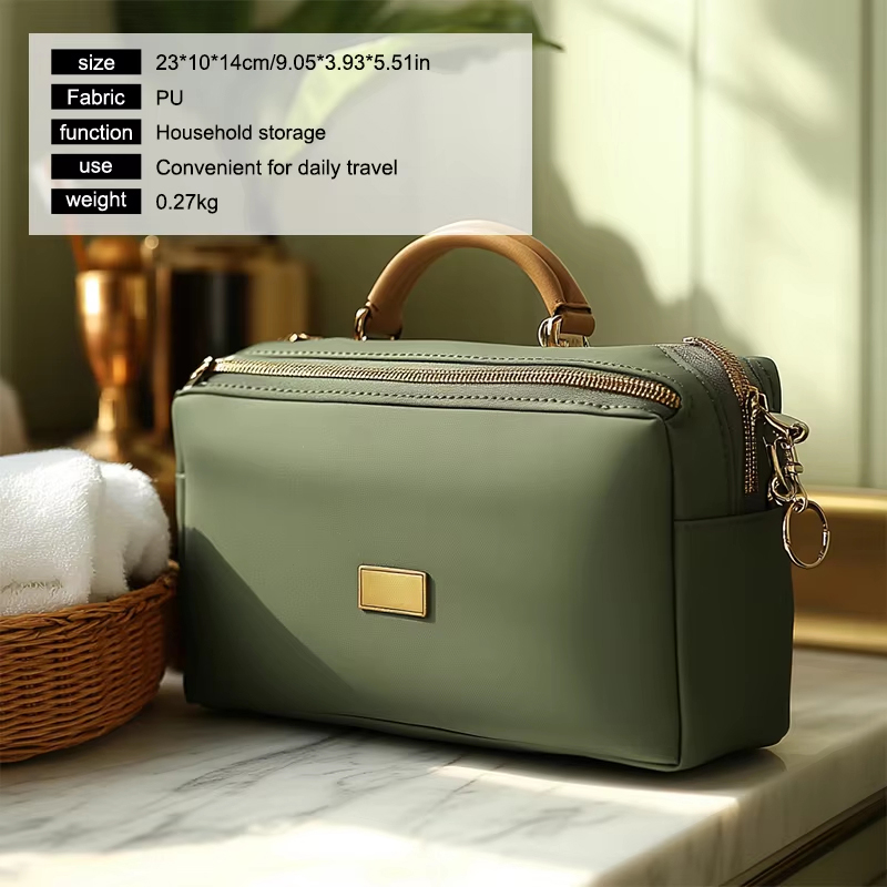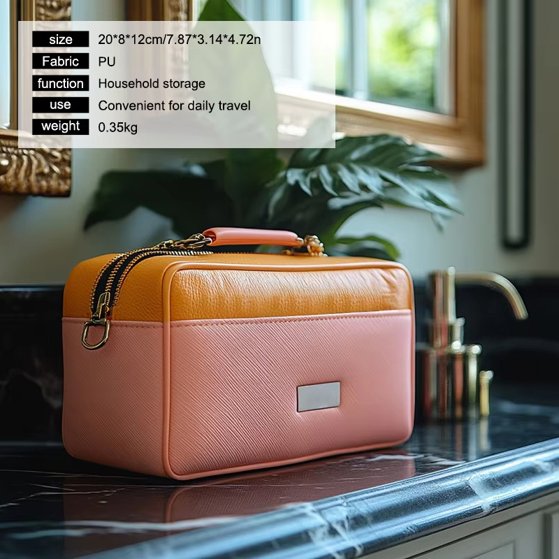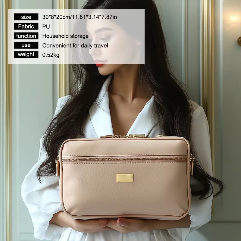 Realizzata in pelle PU, la borsa cosmetica portatile in pelle vanta un aspetto sofisticato e senza tempo. La texture liscia della pelle PU non solo aggiunge un tocco di lusso ma garantisce anche che la borsa sia resistente all'usura. Il materiale resistente gli consente di resistere all'uso quotidiano, rendendolo un compagno affidabile sia per i viaggi che per lo stoccaggio quotidiano.