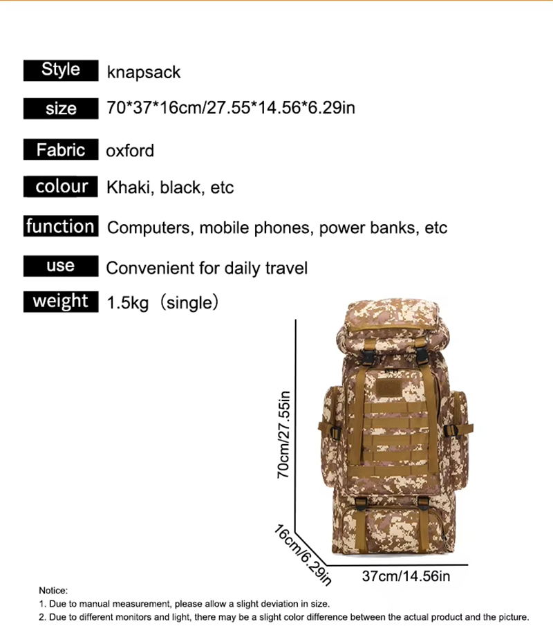 La versatilità di questo zaino lo rende adatto a una vasta gamma di attività all'aperto. Che tu ami l'escursionismo, il campeggio, la pesca o anche i viaggi, lo zaino da esterno pieghevole impermeabile tattico si adatta alle tue esigenze. La sua capacità di proteggere la tua attrezzatura dagli agenti atmosferici e il suo design studiato lo rendono un ottimo compagno per qualsiasi avventura all'aria aperta.
