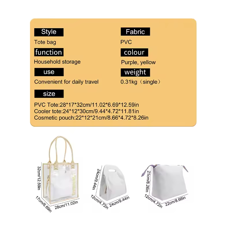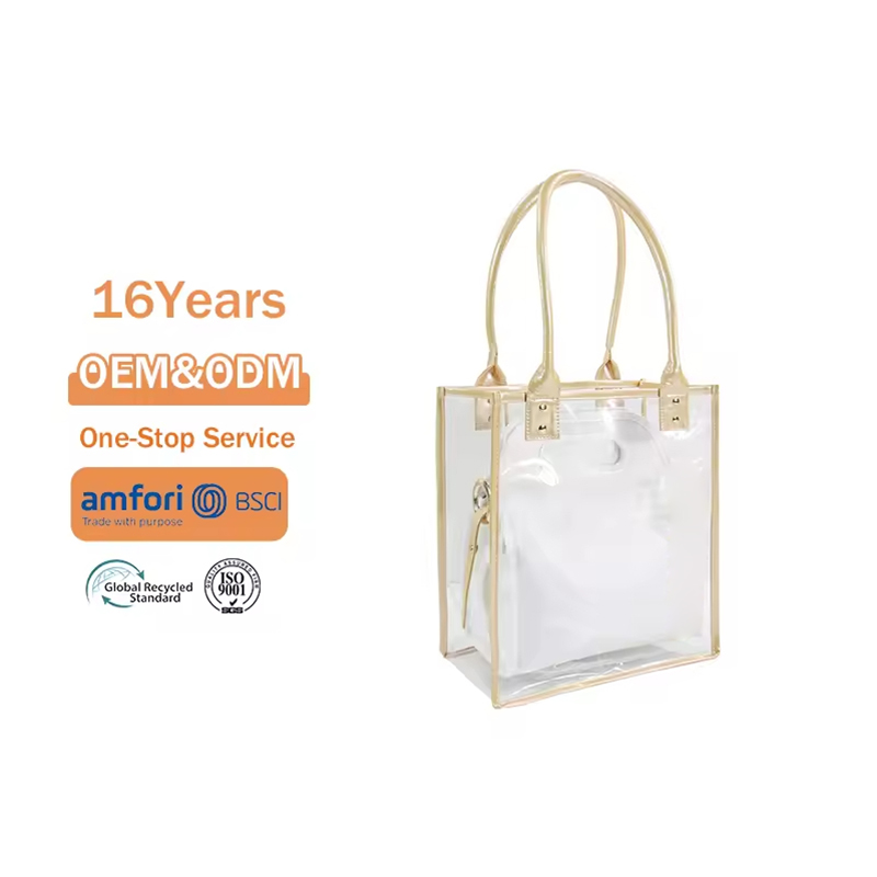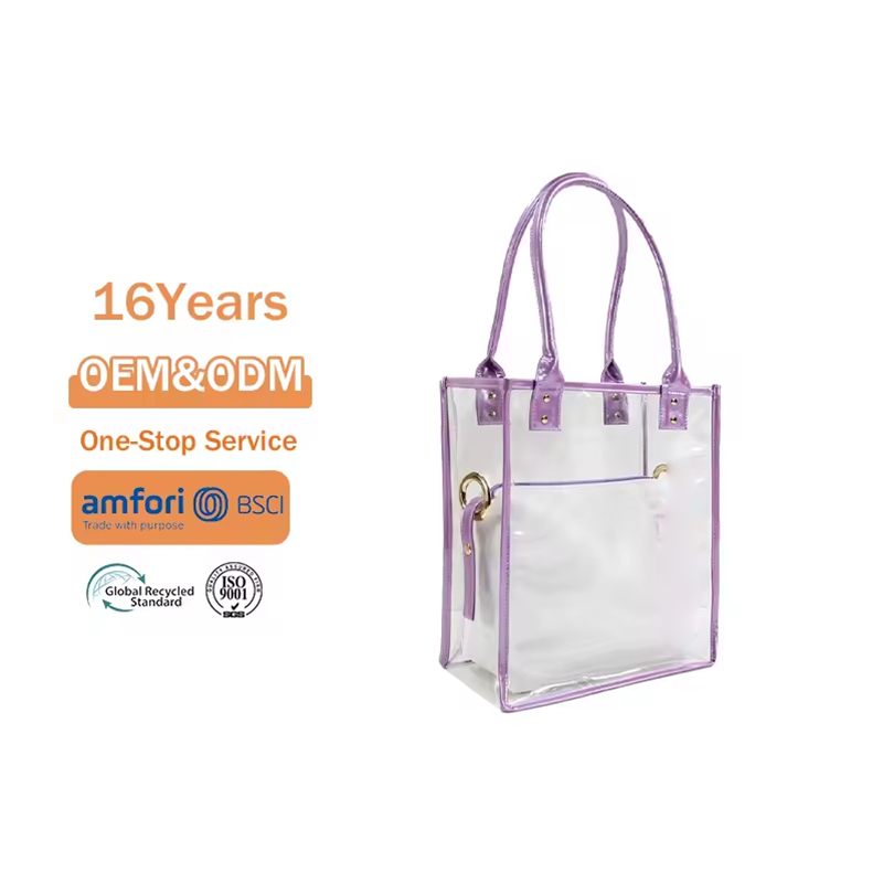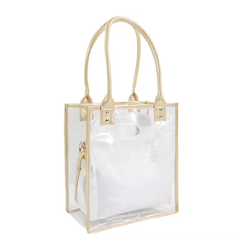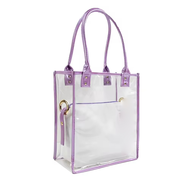 Questa borsa della spesa in PVC trasparente unisce lo stile moderno alla praticità. Il design trasparente ti consente di localizzare rapidamente i tuoi articoli, risparmiando tempo durante lo shopping o il viaggio. Il suo aspetto pulito e minimale lo rende adatto a diverse occasioni, dalla spesa agli eventi all'aperto.